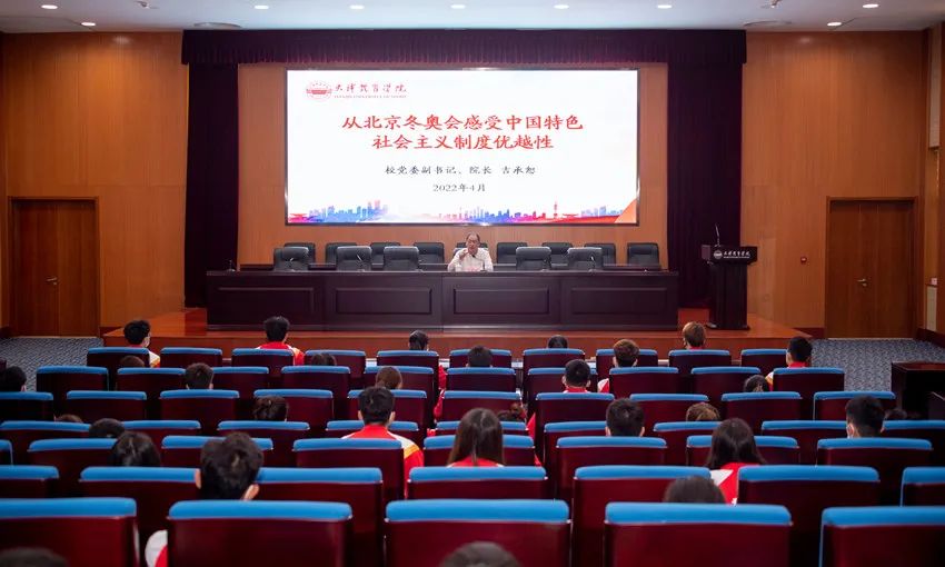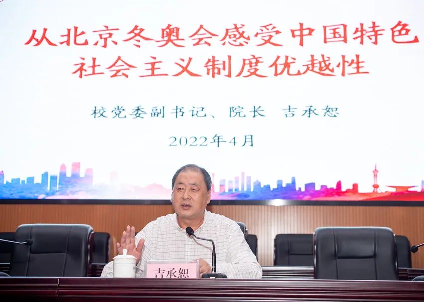 4月28日,党委副书记、院长吉承恕为万象城大学生讲授了题为“从北京冬奥会感受中国特色社会主义制度优越性”的形势与政策第一课。