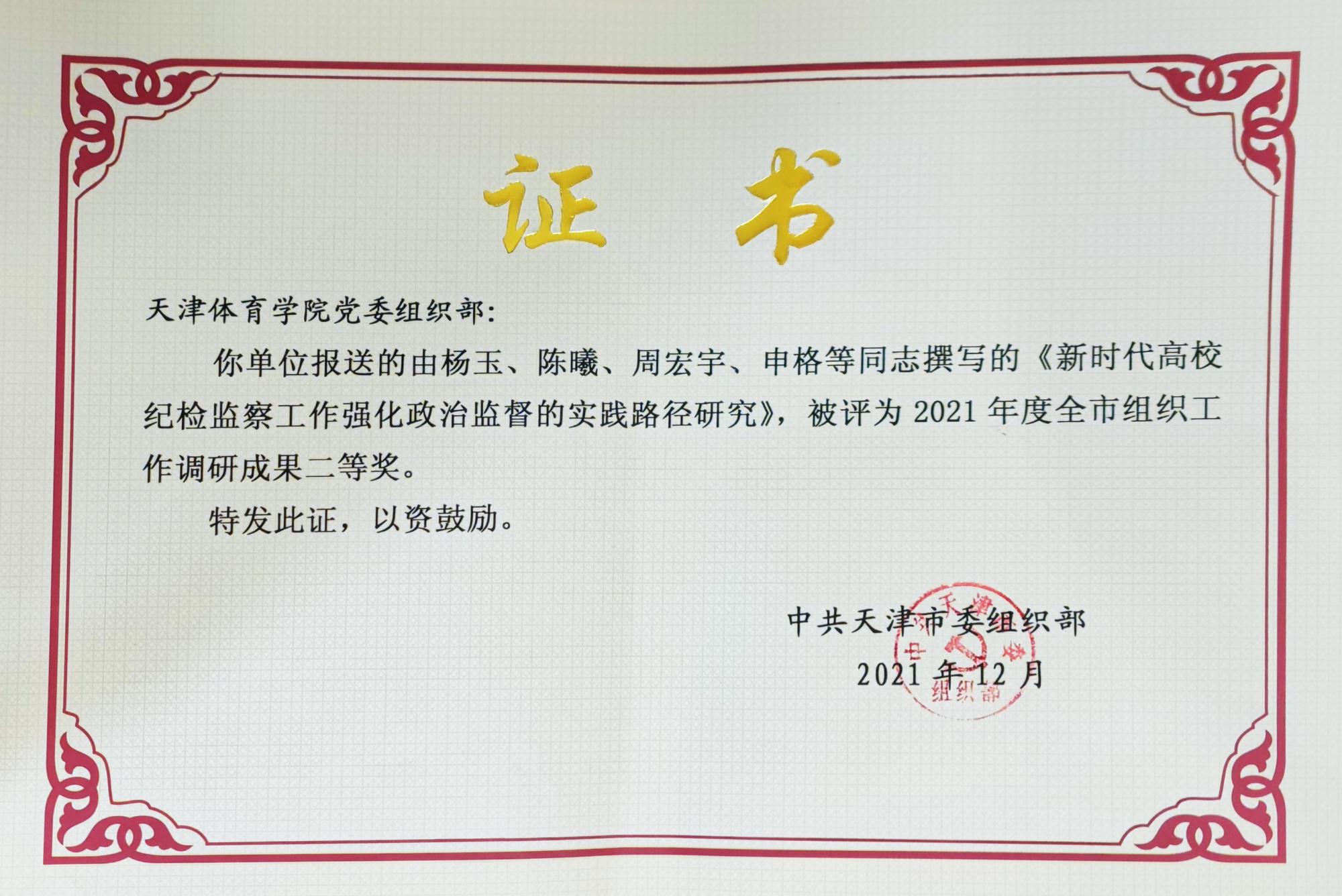 日前,市委组织部公布2021年度全市组织工作课题调研成果获奖情况,万象城社会体育与健康科学学院党委副书记、纪委书记杨玉同志作为课题负责人上报的《新时代高校纪检监察工作强化政治监督的实践路径研究》,荣获天津市2021年度组织工作调研成果二等奖。