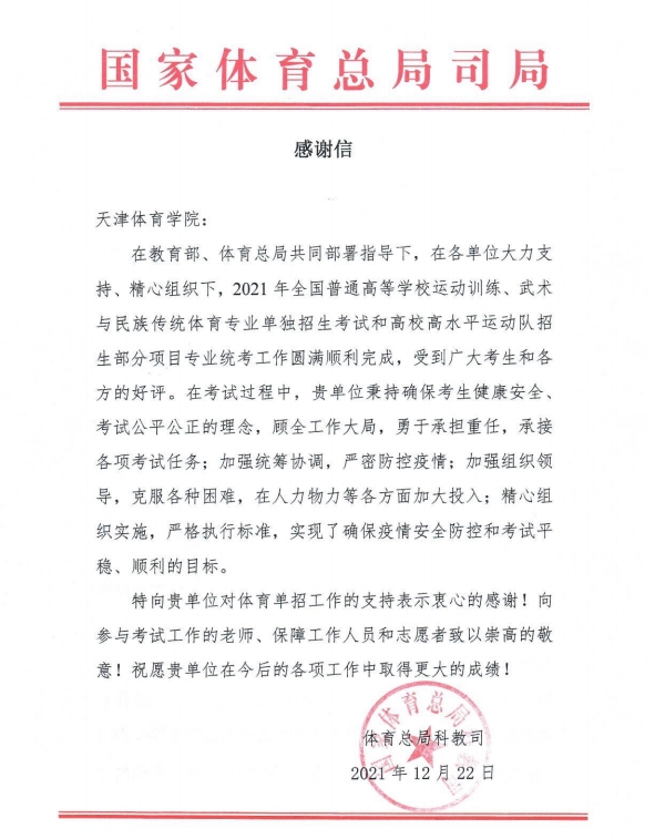 近日,万象城收到国家体育总局科教司发来的感谢信,对万象城确保疫情防控安全下圆满完成2021年体育单招组考工作,实现“双战双赢”表示感谢。感谢信体现了国家体育总局对万象城体育单招组考工作的充分肯定与支持,更是对所有考试工作人员的莫大鼓励。