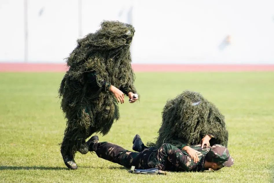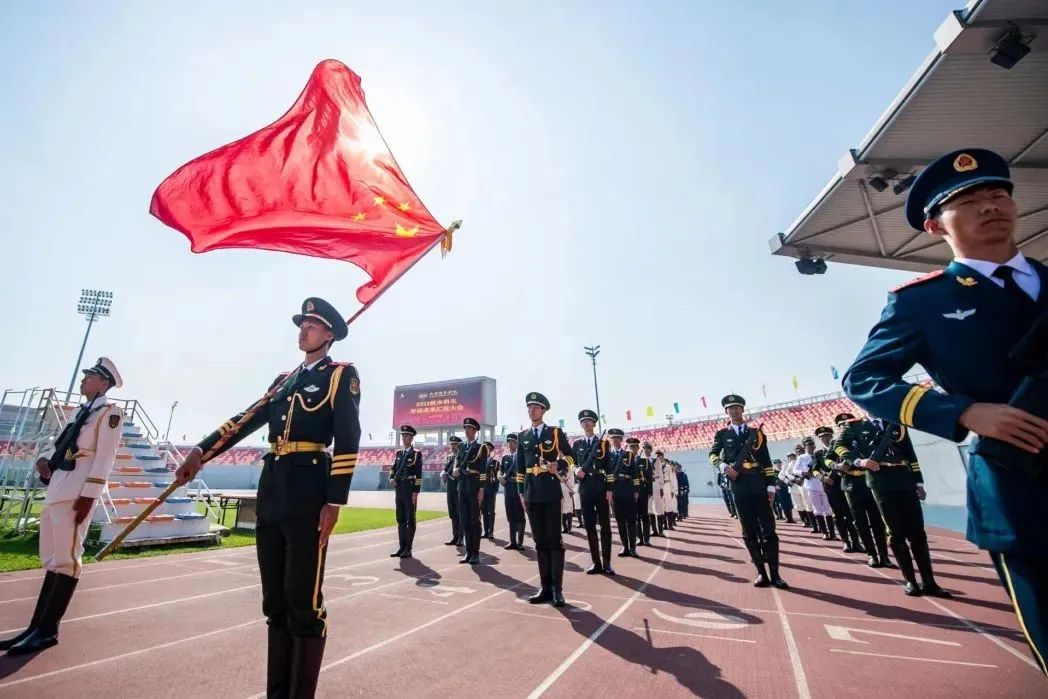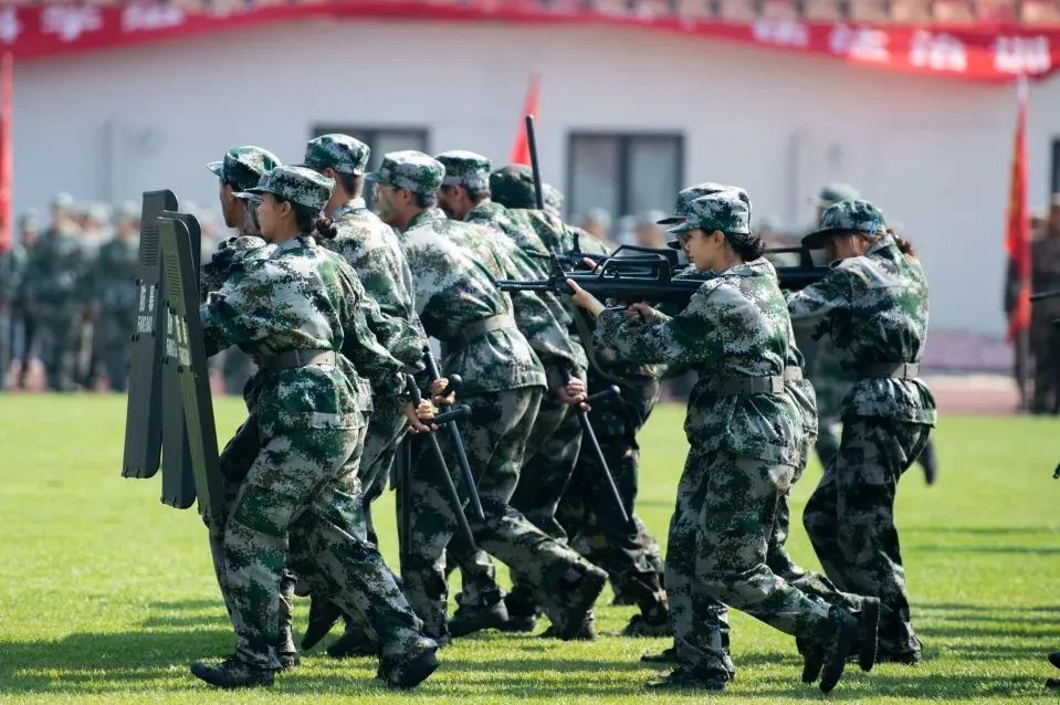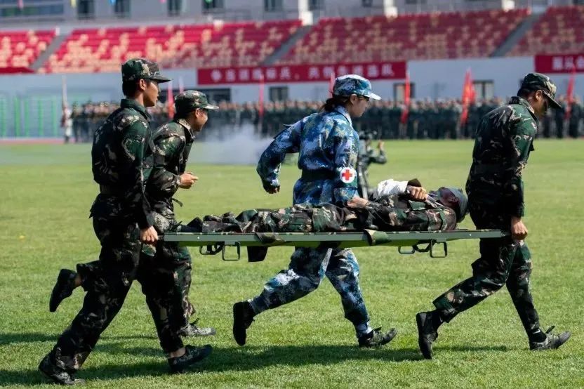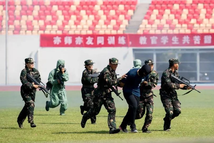 大会在雄壮的国歌声中拉开序幕。伴随着《分列式进行曲》,三军仪仗队和16个连队的千余名2022级新生,依次走过主席台接受检阅。同学们步伐坚定整齐、军姿飒爽挺拔、口号刚毅嘹亮、精神昂扬饱满,全面展示了军训成果。2022级本科生军训团摔擒方队与战术方队进行了军事技能表演。他们巧妙地将捕俘拳、打背包、战术对抗、核生化防护及战场救护等军事技能展示,与疫情防控演练相结合,展现了天体学子情系国防、荣校报国的使命担当。