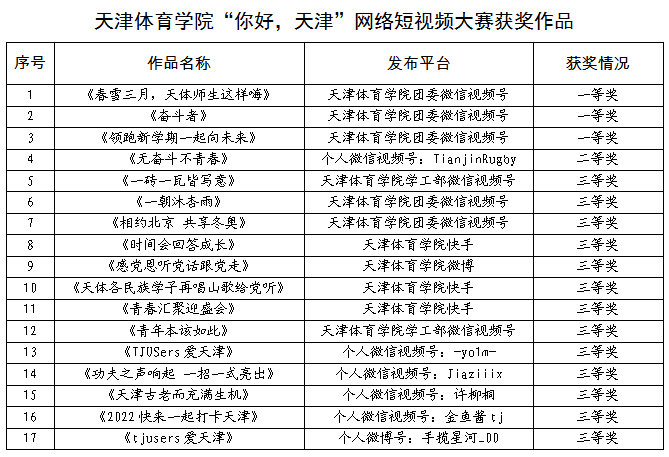 《春雪三月,天体师生这样嗨》《奋斗者》《领跑新学期一起向未来》获得一等奖。《无奋斗不青春》获得二等奖。《一砖一瓦皆写意》《一朝沐杏雨》《相约北京 共享冬奥》《时间会回答成长》《感党恩听党话跟党走》《天体各民族学子再唱山歌给党听》《青春汇聚迎盛会》《青年本该如此》《TJUSers爱天津》《功夫之声响起 一招一式亮出》《天津古老而充满生机》《2022快来一起打卡天津》《tjusers爱天津》获得三等奖。