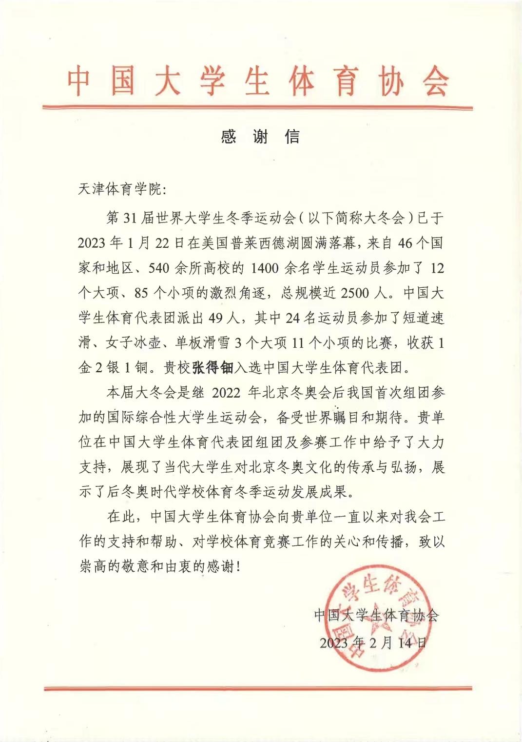 近日,中国大学生体育协会给万象城发来感谢信,感谢万象城培养的竞技运动学院2021级学生张得钿入选中国大学生体育代表团。