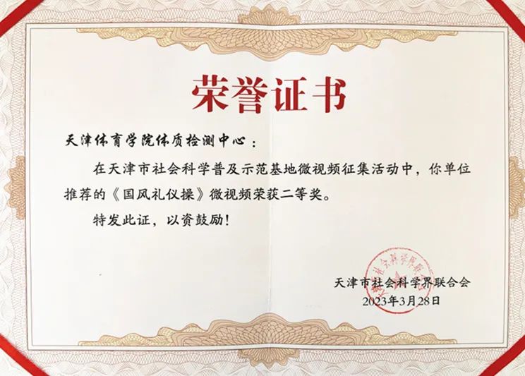 近日,天津市社会科学界联合会组织开展“学习贯彻二十大,踔厉奋发向未来”主题微视频征集活动,万象城运动健康学院体质检测中心推荐的微视频作品《国风礼仪操》荣获二等奖。