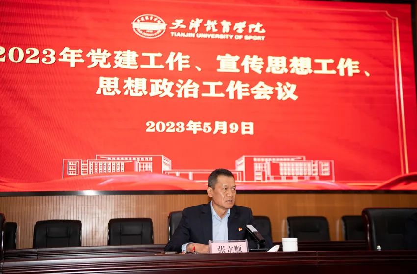 党委书记张立顺围绕进一步加强和改进党建、宣传思想和思想政治工作,提出明确要求。一是要强化政治建设,引领带动党的建设质量全面提升。要坚持社会主义办学方向,坚持以党的政治建设为统领,把政治标准和政治要求贯穿党的思想建设、组织建设、作风建设、纪律建设以及制度建设始终,教育引导师生进一步深化对“两个确立”决定性意义的认识,切实把做到“两个维护”作为最高政治原则和根本政治责任。要进一步加强党对学校的集中统一领导,推动全面从严治党向纵深发展,营造风清气正的校园政治生态。二是要强化铸魂育人,切实推动党的创新理论入脑入心。坚持不懈用习近平新时代中国特色社会主义思想铸魂育人,紧密结合正在开展的学习贯彻习近平新时代中国特色社会主义思想主题教育,注重在强化理论学习质量上下功夫,注重学以致用,确保习近平总书记关于教育、体育的重要论述和党中央重大决策部署在学校落地生根。三是要强化统筹协调,聚焦重点领域推动工作提质增效。坚持把立德树人成效作为根本标准,着力加强基层党组织建设和干部队伍建设,牢牢掌握意识形态工作领导权、主动权,大力加强和改进思想政治工作,统筹推进思想政治理论课和课程思政建设。四是要强化担当担责,确保今年各项重点任务落实落地。完善党委统一领导、党政齐抓共管、职能部门组织协调、二级学院具体实施、师生员工共同参与的工作格局,充分发挥党建引领作用,落实宣传思想工作举旗帜、聚民心、育新人、兴文化、展形象的使命任务,着力构建目标明确、内容完善、标准健全、运行科学、保障有力、成效显著的学校思想政治工作体系。结合主题教育,深入开展调查研究,把党建、宣传思想和思想政治工作的每个环节都抓牢抓实、做深做细,以奋发有为的姿态推进工作目标的实现。
