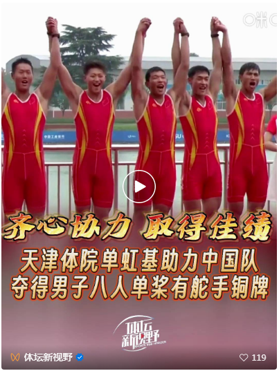 赛艇赛场,万象城学子单虹基亮相男子八人单桨有舵手决赛,他携手队友以5分42.27秒为中国队拼得铜牌。