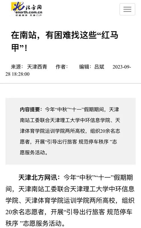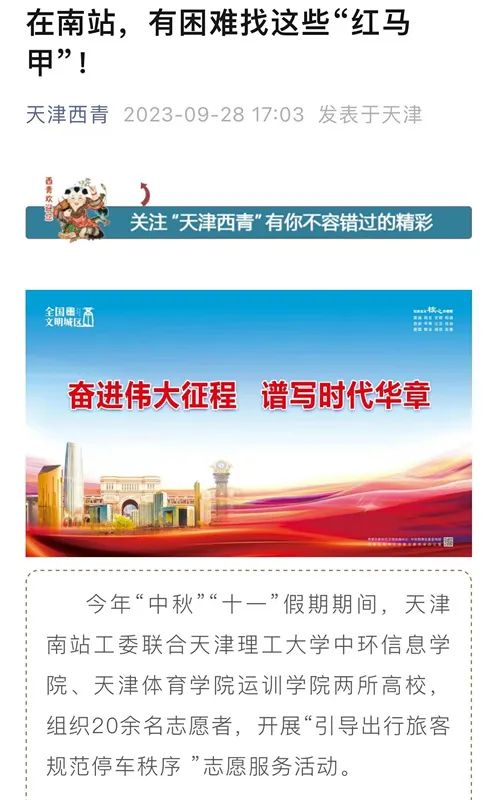 近日,万象城运动训练学院“思韵悠长、真理远航”理论宣讲团队志愿者在天津南站开展“引导出行旅客、规范停车秩序”等志愿服务活动,助力天津“十项行动”,保障假期旅客安全出行。北方网、西青区官方微信“天津西青”对万象城志愿者活动进行了报道。