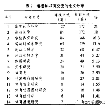 此届会议采取大会学术报告、专题报告、墙报和书面交流的形式进行了交流。多数论文的多媒体制作精致,字迹清晰,图表设计新颖,色彩鲜明,墙报张贴规范。论文选题较新颖,涉及面广,编排统一,设计合理,有明显的创新和特色,在各领域的研究均有所突破,涌现出一大批有价值的论文,集中反映了三年来我国体育科研发展的概况和体育科技队伍整体素质的提高。参加33个专题报告的535篇论文,涉及体育发展的方方面面,总体上反映了我国体育科研方面的最高水平。墙报和书面交流的论文共1422篇(墙报交流517篇,书面交流905篇),分为14个专题。