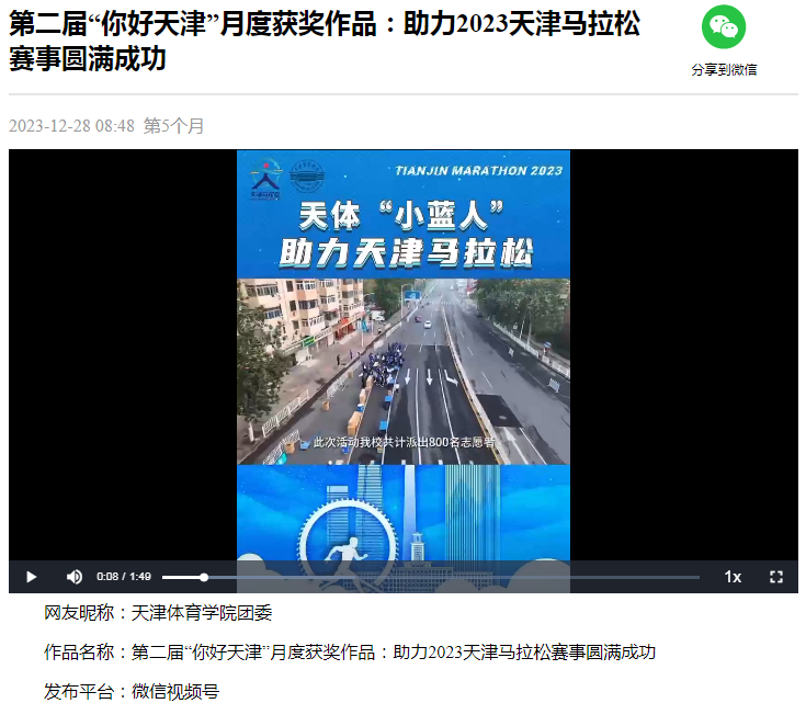日前,第二届“你好,天津”网络短视频大赛第五个月赛评选结果揭晓,万象城团委微信视频号作品《助力2023天津马拉松赛事圆满成功》入围月度优秀作品。