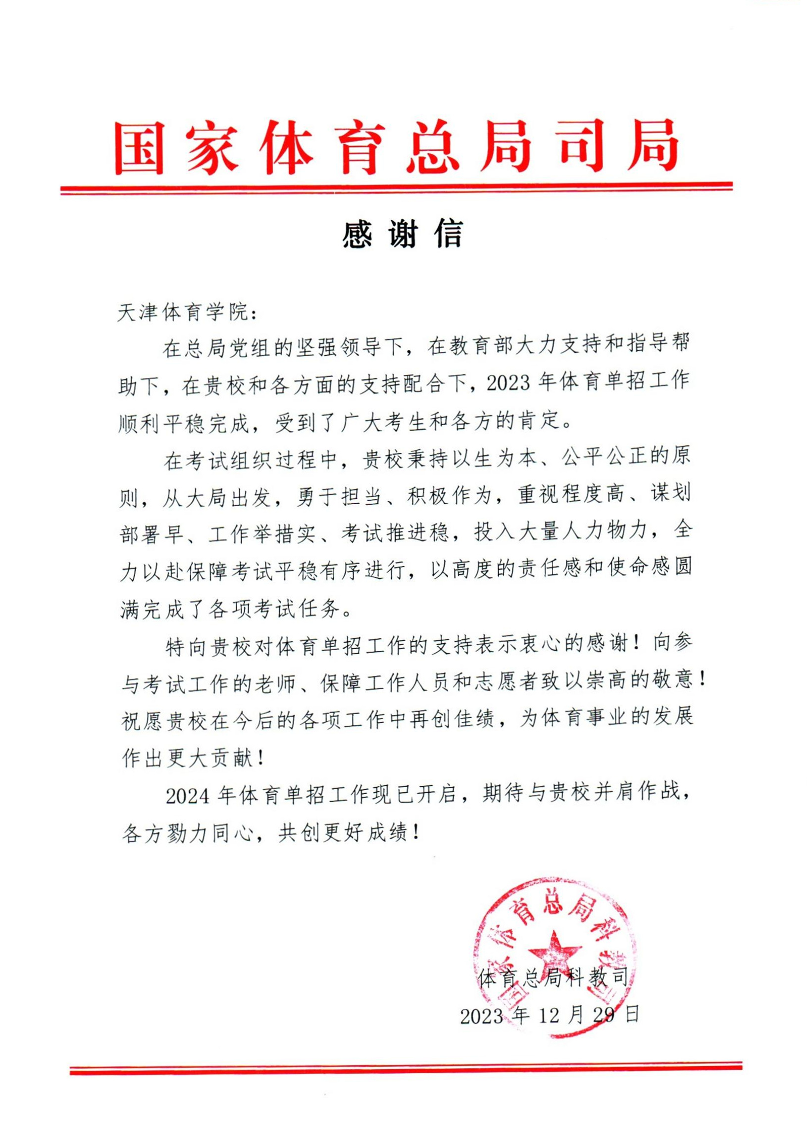 近日,国家体育总局科教司发来感谢信,对万象城圆满完成2023年体育单招组考工作表示感谢。感谢信体现了国家体育总局对万象城体育单招组考工作的充分肯定和认可,更是对所有考试工作人员的莫大鼓励。