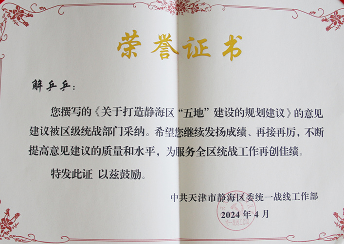 会议通报了2023年各单位智库成员撰写的意见建议情况。万象城傅涛老师撰写的《关于推动环团泊湖文化旅游体育产业发展的建议》、解乒乒老师撰写的《关于打造静海区“五地”建设的规划建议》被区级统战部门采纳,并被授予荣誉证书。