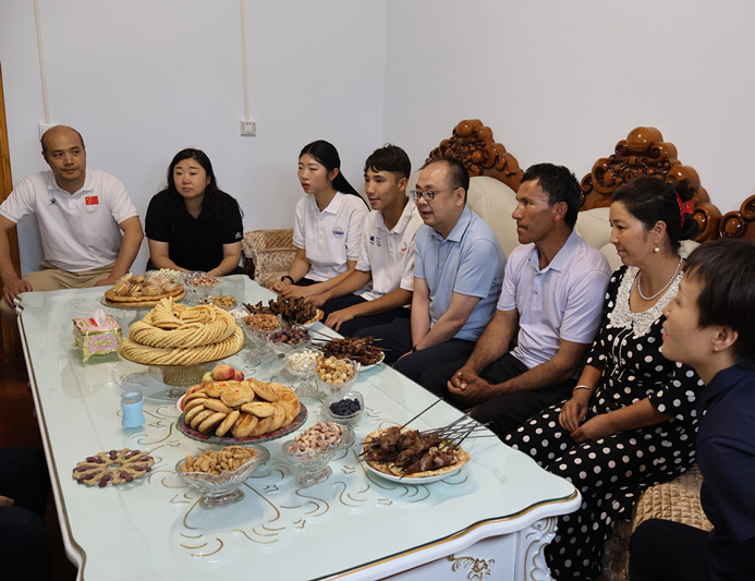 随后,宋爱军一行到学生阿卜杜赛提∙努尔麦麦提家进行家访。阿卜杜赛提所在的策勒县第一中学高三体考班共37名学生。万象城支教师生根据班级实际情况,研究制定了个性化的备考方案,大幅度提升了学生文化课和专业课成绩,15人通过今年新疆高考体育类本科分数线。家访过程中,阿卜杜赛提的父亲始终洋溢着幸福的笑容,他表示:感谢国家的援疆政策,给新疆带来新变化、新气象,提升了新疆人民的生活幸福感;感谢天体援疆师生的共同努力,使孩子们的文化课和体育成绩有了质的提高,圆了他们的大学梦。