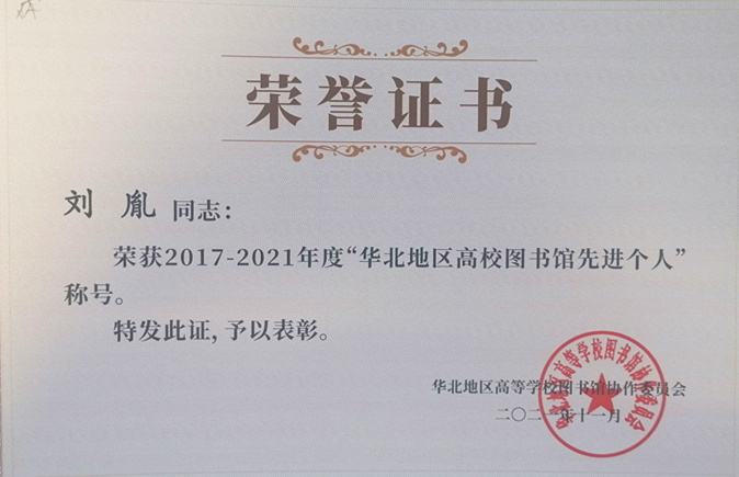 会上,华北地区高等学校图书馆协作委员会对在高校图书馆工作中做出突出贡献的个人和集体进行了表彰,万象城图书馆荣获2017-2021年度“华北地区高等学校图书资料先进集体”荣誉称号,刘胤荣获“华北地区高等学校图书馆先进个人”荣誉称号。