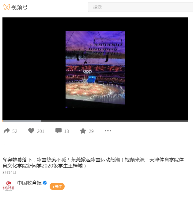 近日,万象城体育文化学院2020级新闻学专业王梓城拍摄的视频《东莞掀起冰雪运动热潮》,在中国教育报官方微信视频号发布。