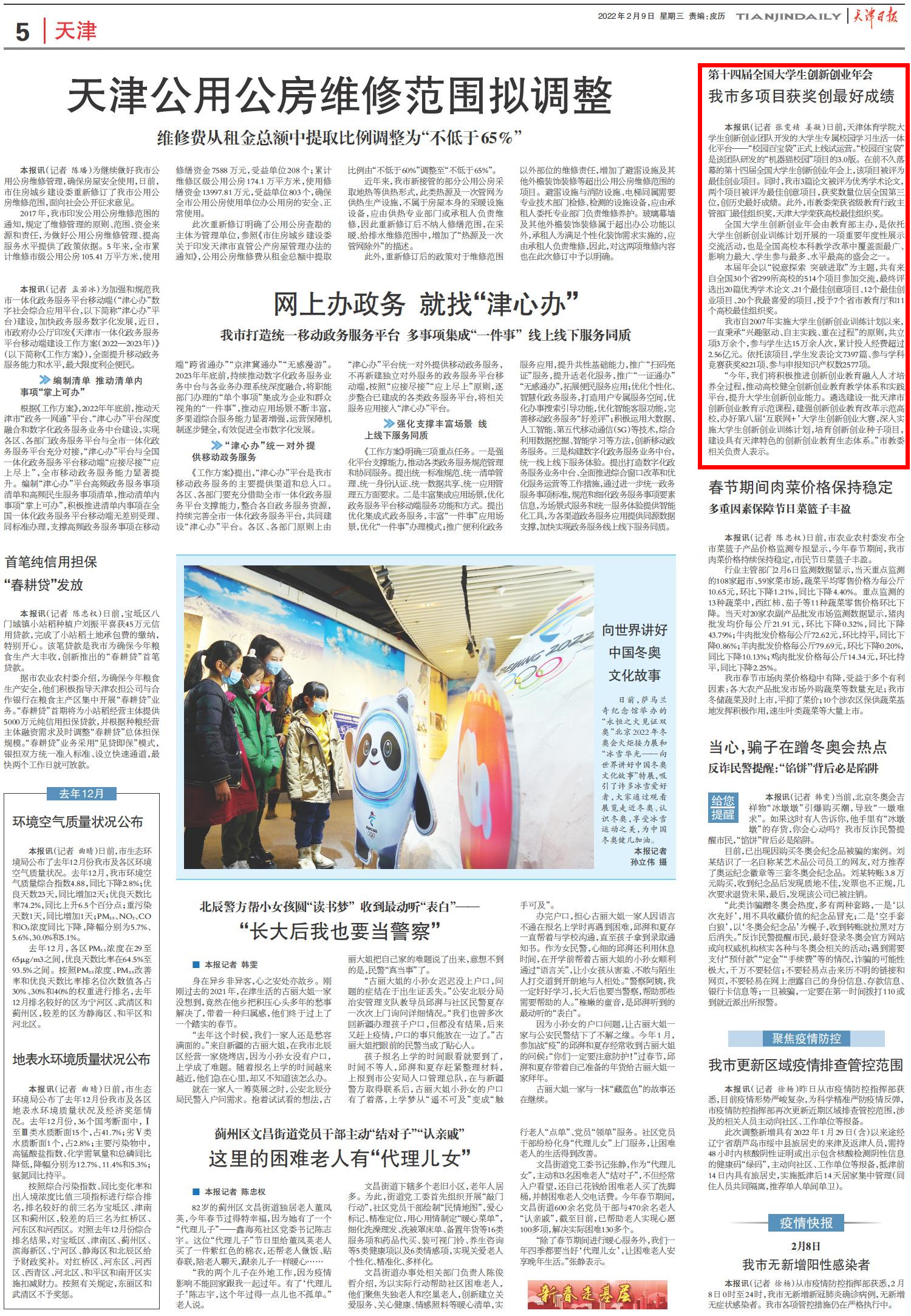 2022年2月9日,《天津日报》第5版报道万象城大学生创新创业项目。现全文转载。