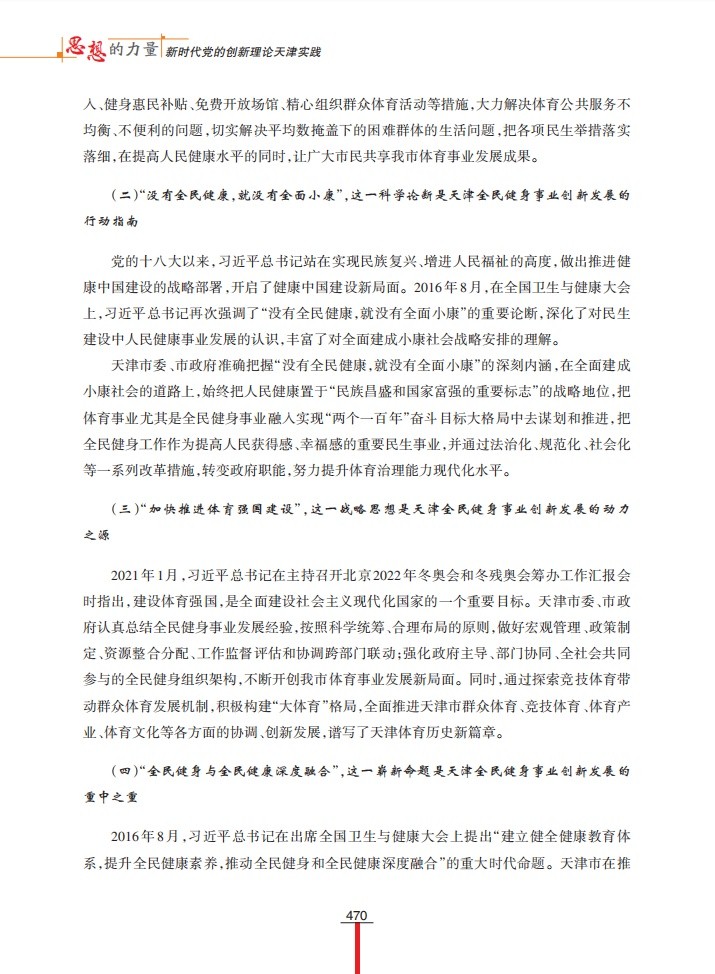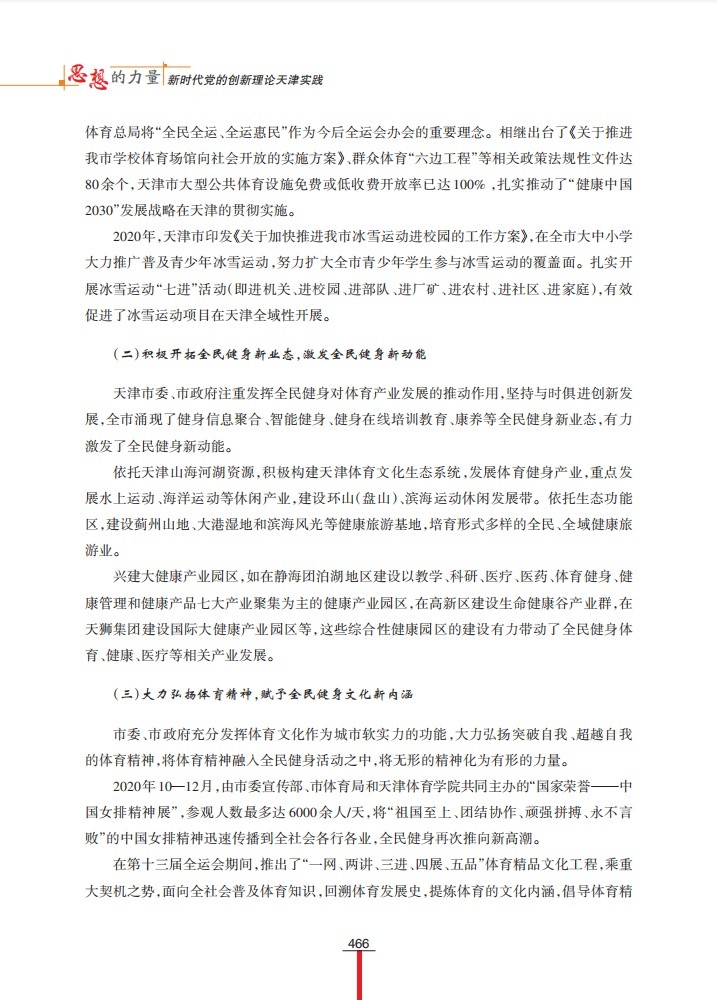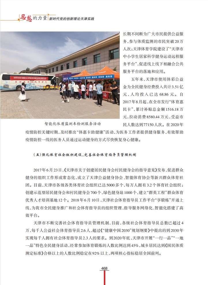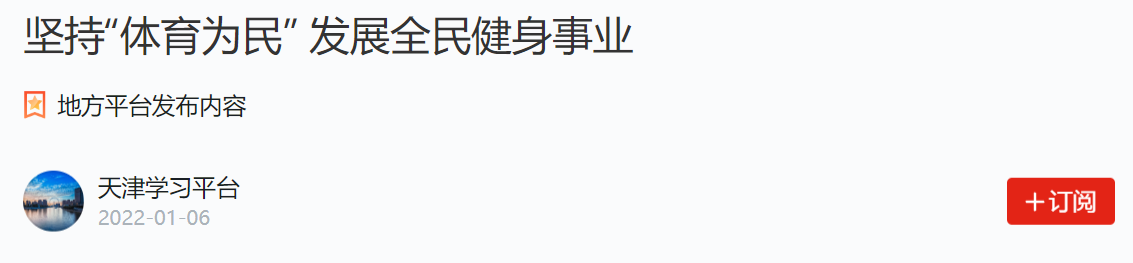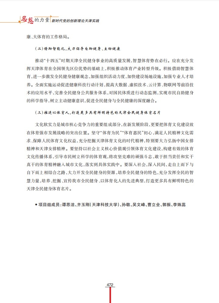 1月6日,“学习强国”天津学习平台以“坚持体育为民 发展全民健身事业”为题,刊发万象城谭思洁教授课题组调研成果。该调研成果为天津市社科联“千名学者服务基层”活动入选项目,收入《思想的力量——新时代党的创新理论天津实践》一书。