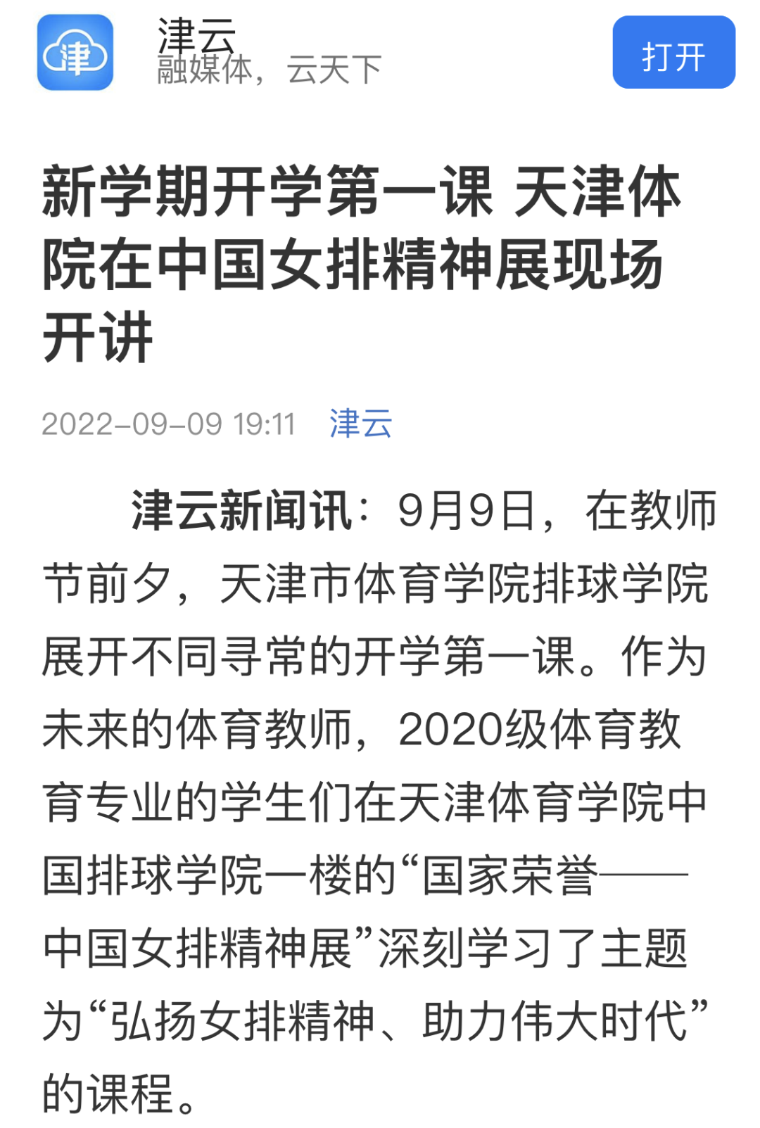 开学第一课 天津体院传承中国女排精神