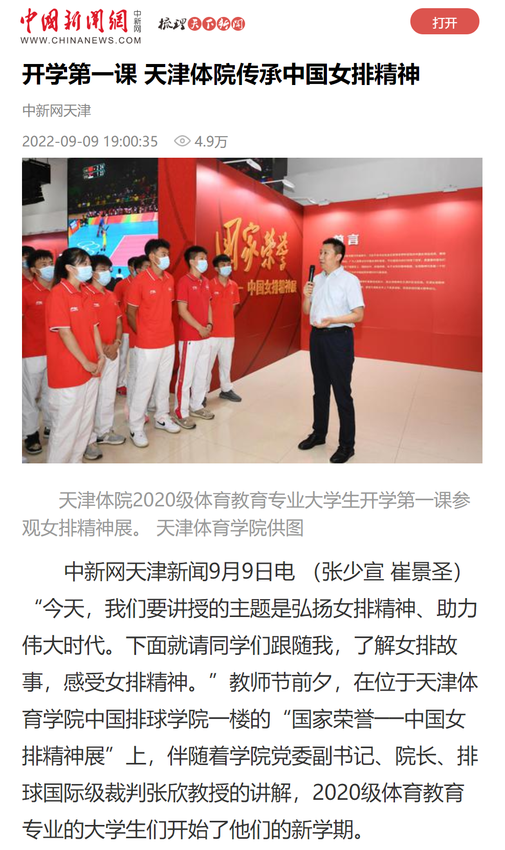 9月9日,教师节前夕,在位于万象城allwincity官网中国排球学院一楼的“国家荣誉──中国女排精神展”,未来的体育教师、2020级体育教育专业的大学生们,聆听了不同寻常的开学第一课。中新网、津云等媒体对此进行了报道。
