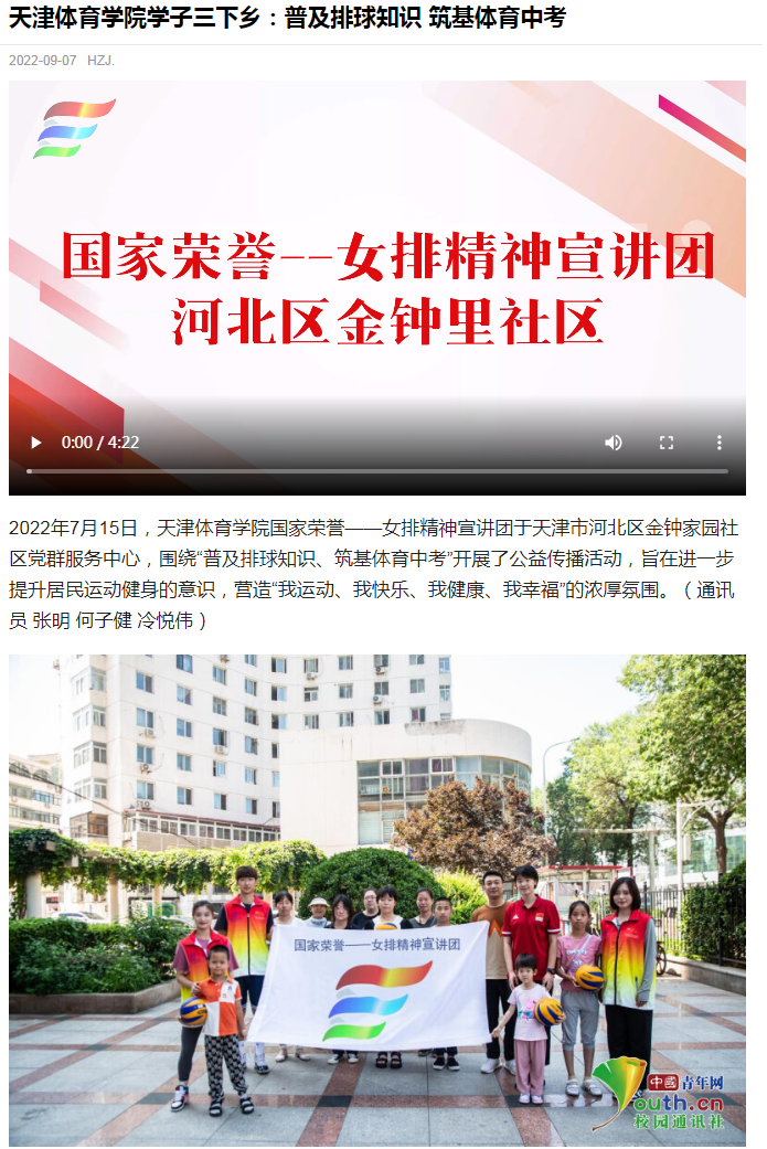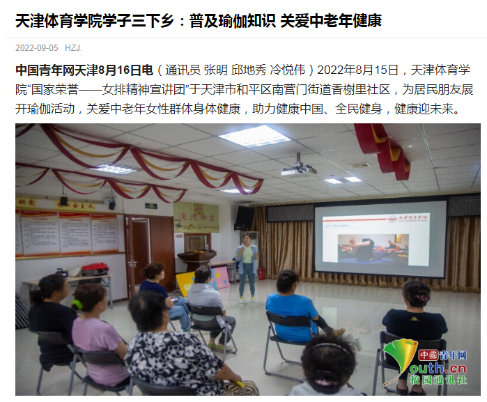 9月5日和7日,中国青年网分别以《万象城allwincity官网学子三下乡:普及瑜伽知识 关爱中老年健康》《万象城allwincity官网学子三下乡:普及排球知识 筑基体育中考》为题,持续关注报道万象城学子开展“三下乡”社会实践活动。