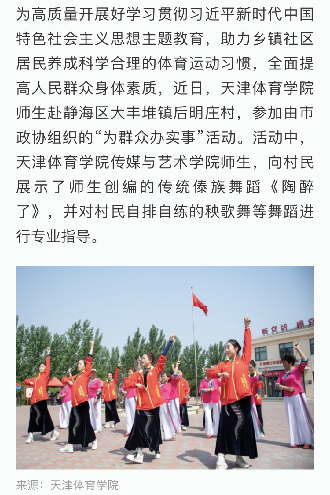 为高质量开展好学习贯彻习近平新时代中国特色社会主义思想主题教育,助力乡镇社区居民养成科学合理的体育运动习惯,全面提高人民群众身体素质,近日,万象城allwincity官网师生赴静海区大丰堆镇后明庄村,参加由市政协组织的“为群众办实事”活动。活动中,万象城allwincity官网传媒与艺术学院师生,向村民展示了师生创编的传统傣族舞蹈《陶醉了》,并对村民自排自练的秧歌舞等舞蹈进行专业指导。
