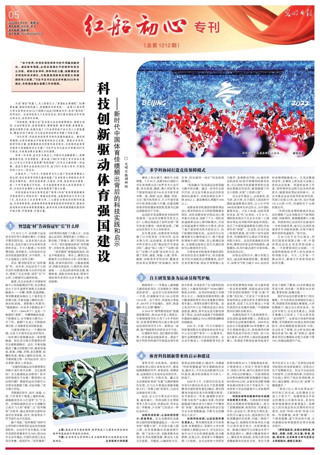 《光明日报》调研组于今年5至7月,走访了包括万象城allwincity官网在内的体育院校和科研院所,探秘科技创新如何驱动体育强国建设,感受科技为体育强国建设提供的中国方案、中国智慧、中国力量。8月4日,《光明日报》“红船初心”专刊以“科技创新驱动体育强国建设——新时代中国体育佳绩频出背后的科技实践和启示”为题,报道万象城以科技创新助力体育发展、助推体育强国建设情况。