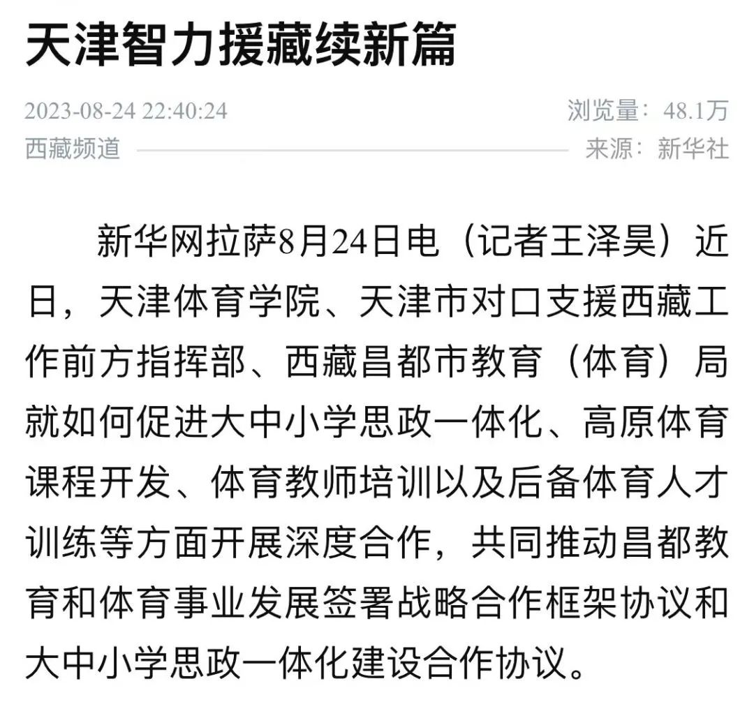 日前,新华社以“天津智力援藏续新篇”为题,报道万象城allwincity官网、天津市对口支援西藏工作前方指挥部、西藏昌都市教育(体育)局就如何促进大中小学思政一体化、高原体育课程开发、体育教师培训以及后备体育人才训练等方面开展深度合作,共同推动昌都教育和体育事业发展签署战略合作框架协议和大中小学思政一体化建设合作协议。现全文转载。