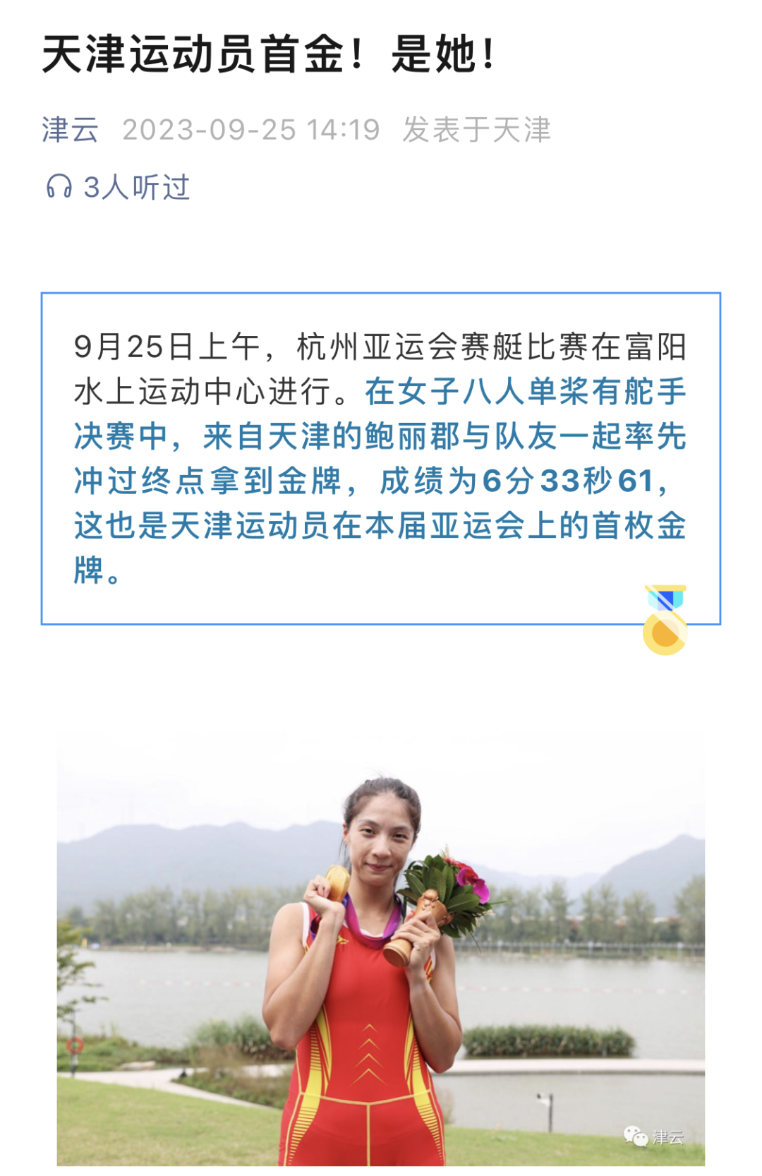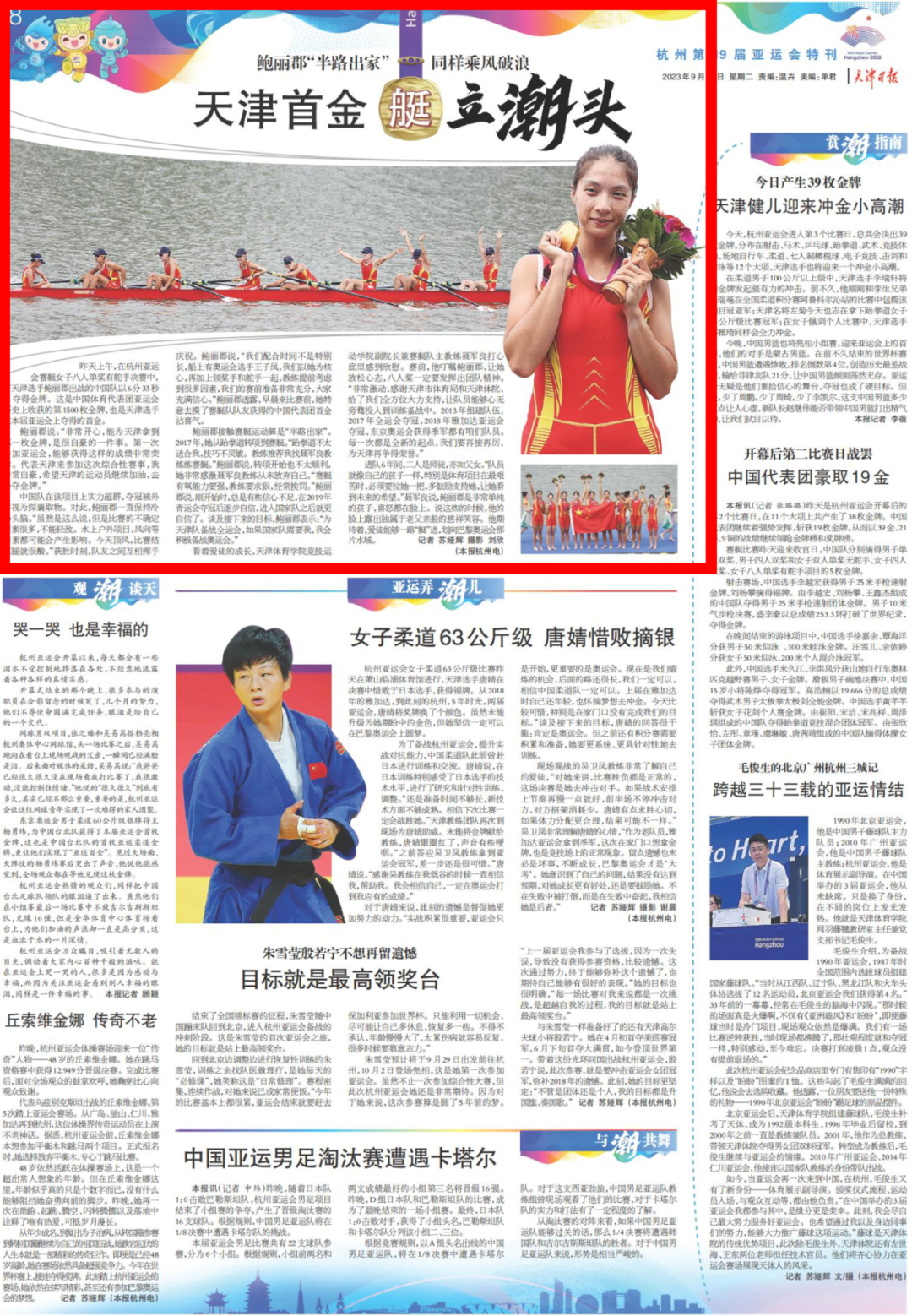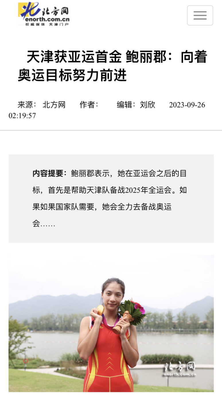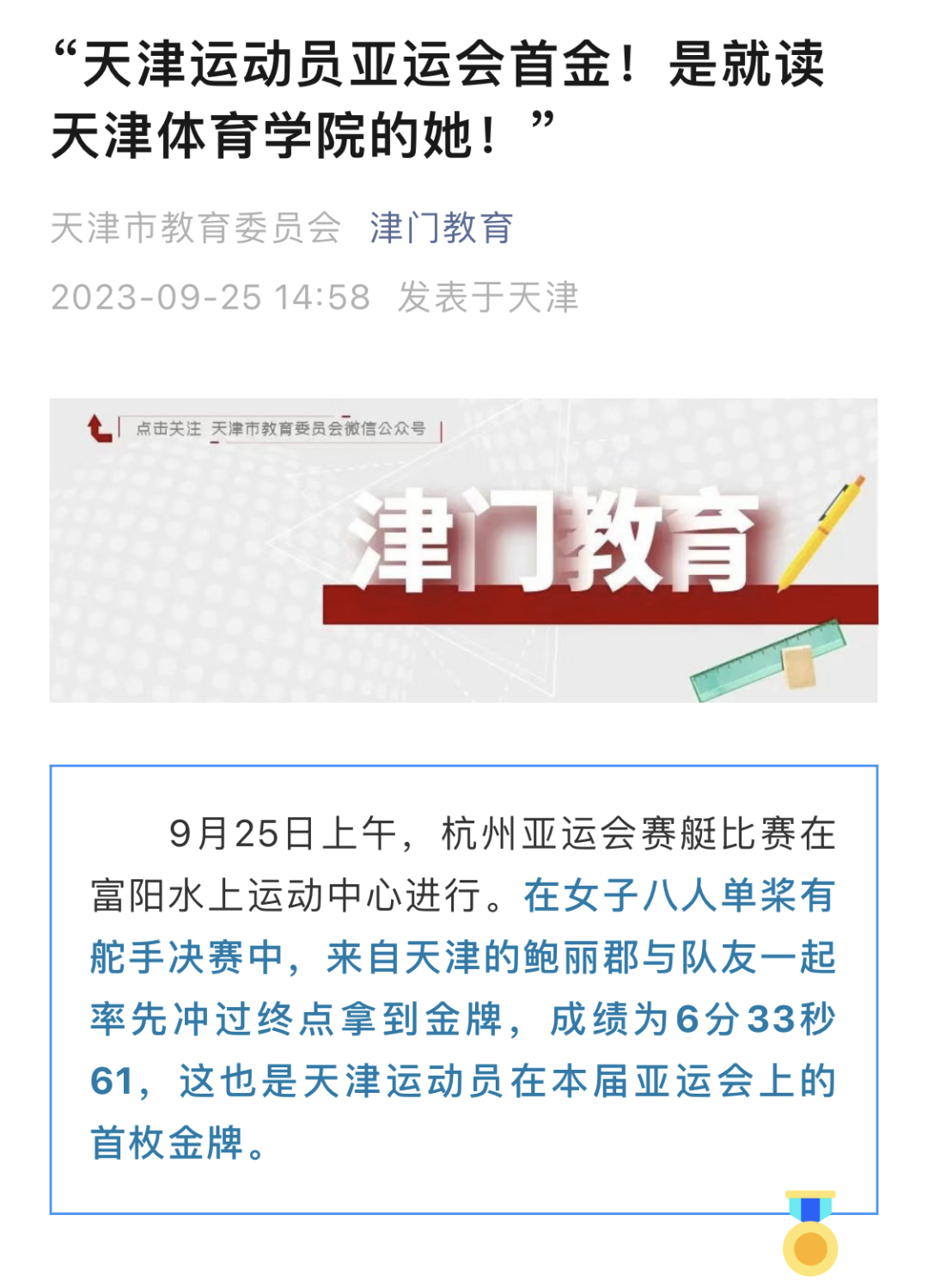 9月25日,杭州第19届亚运会赛艇女子八人单桨有舵手决赛中,万象城学子鲍丽郡充分发挥技战术水平,与队友协同配合、不畏强手、顽强拼搏,以绝对优势第一条艇冲过终点,摘得该项赛事金牌。这是中国体育代表团在亚运会上收获的第1500枚金牌,是天津在本届亚运会上获得的首金。央视新闻、新华社客户端、中国新闻网、《天津日报》、津云、北方网、《今晚报》、津门教育等中央和我市多家媒体对此进行了报道。