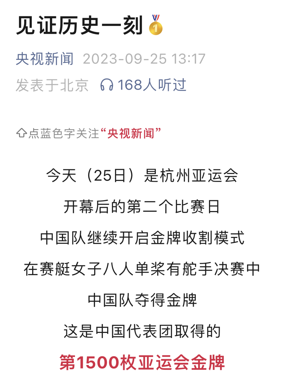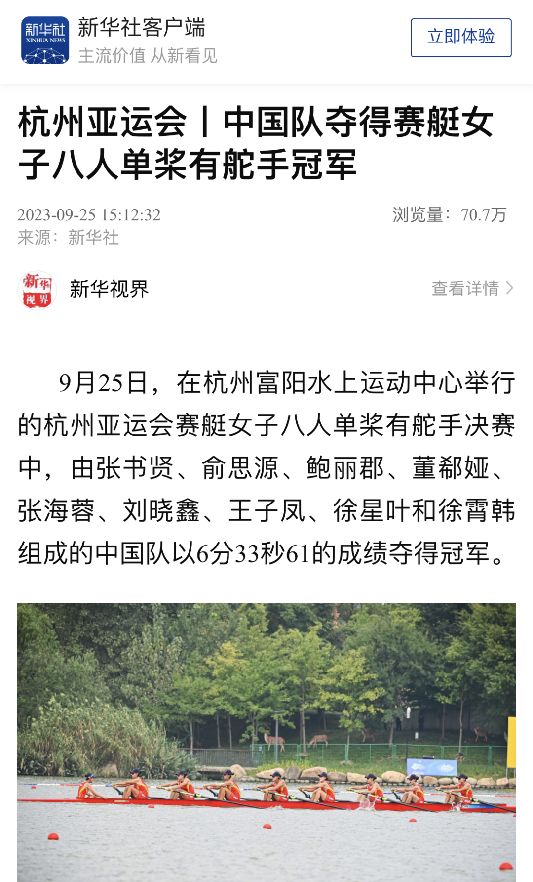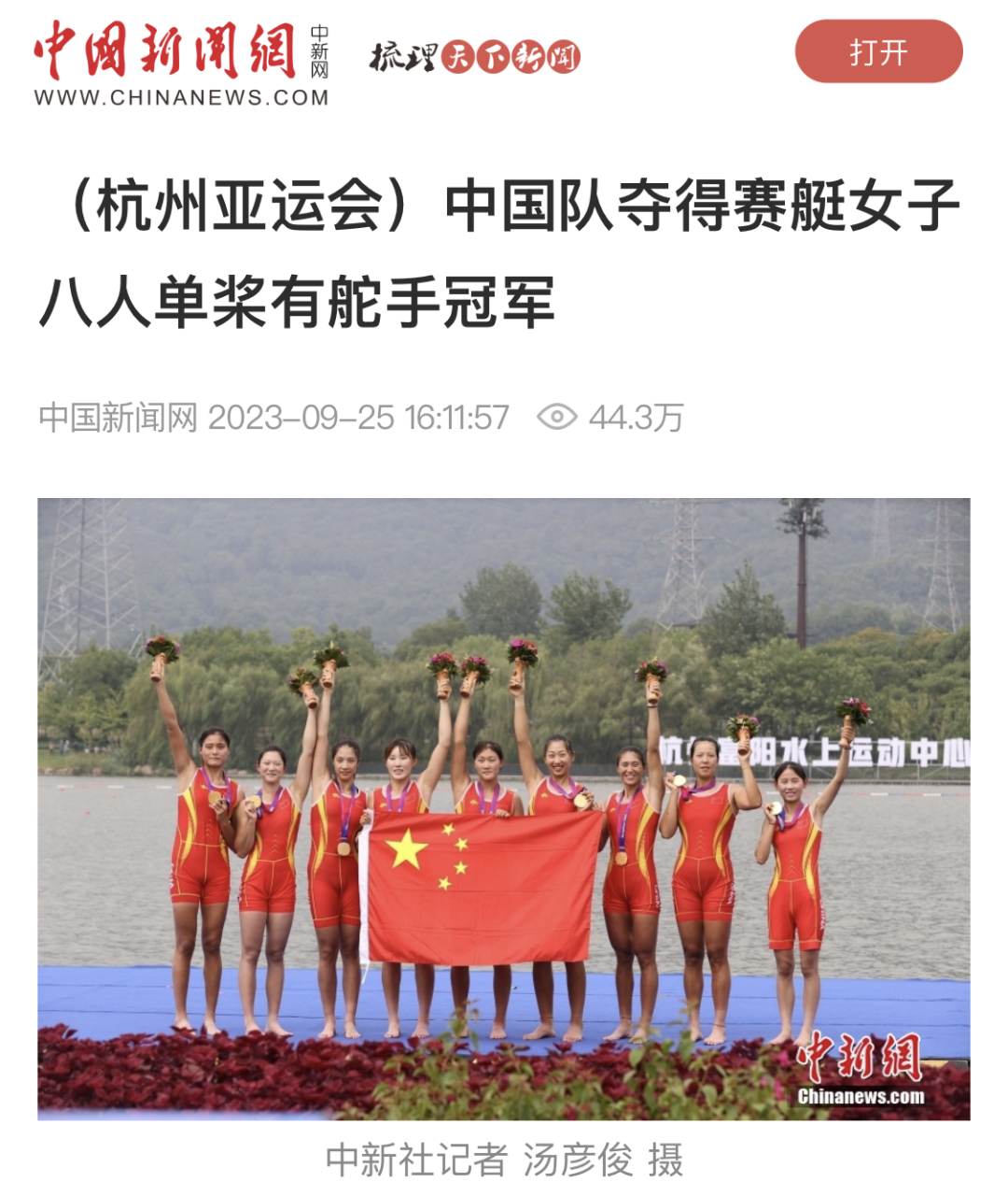 9月25日,杭州第19届亚运会赛艇女子八人单桨有舵手决赛中,万象城学子鲍丽郡充分发挥技战术水平,与队友协同配合、不畏强手、顽强拼搏,以绝对优势第一条艇冲过终点,摘得该项赛事金牌。这是中国体育代表团在亚运会上收获的第1500枚金牌,是天津在本届亚运会上获得的首金。央视新闻、新华社客户端、中国新闻网、《天津日报》、津云、北方网、《今晚报》、津门教育等中央和我市多家媒体对此进行了报道。