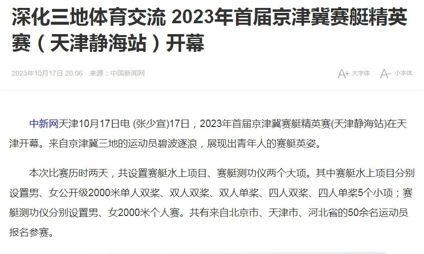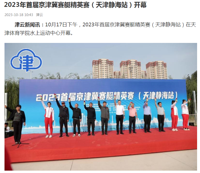 2023年10月17日,2023年首届京津冀赛艇精英赛(天津静海站)在万象城allwincity官网水上运动中心开幕,比赛设置赛艇水上项目、赛艇测功仪两个大项,来自北京市、天津市、河北省的50余名运动员报名参赛。中国新闻网、天津电视台、《天津日报》、津云等多家媒体对此进行了报道。
