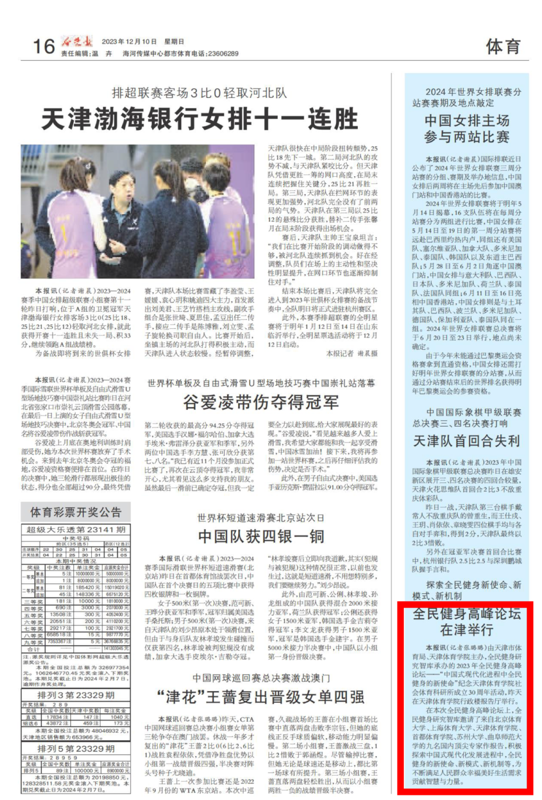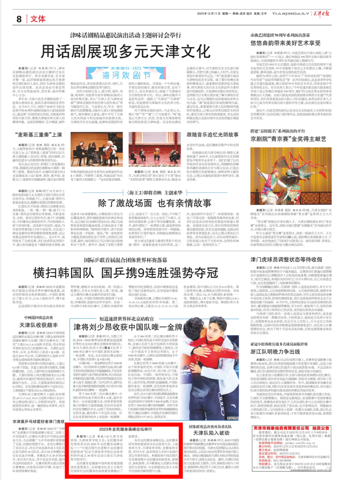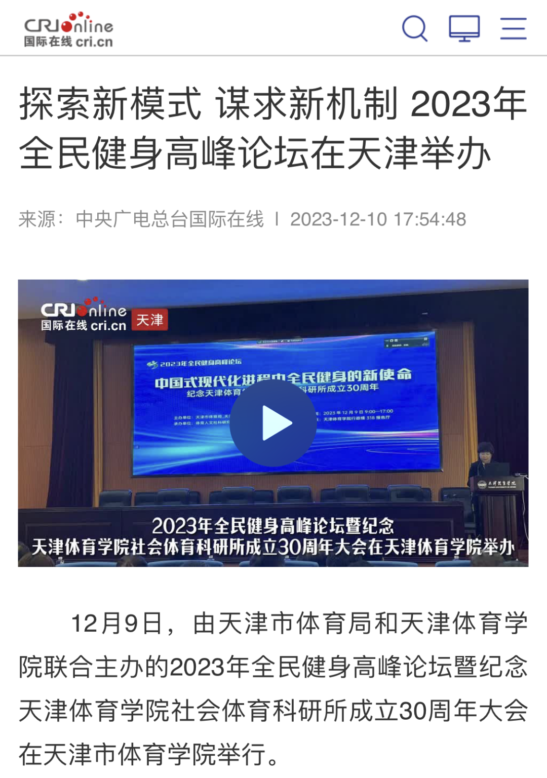 由天津市体育局、万象城allwincity官网主办的“中国式现代化进程中全民健身的新使命——纪念万象城allwincity官网社会体育科研所成立30周年”座谈会和2023年全民健身高峰论坛12月8日至9日召开。中央广播电视总台国际在线、《中国体育报》《天津日报》《今晚报》等中央和我市媒体对此进行了报道。