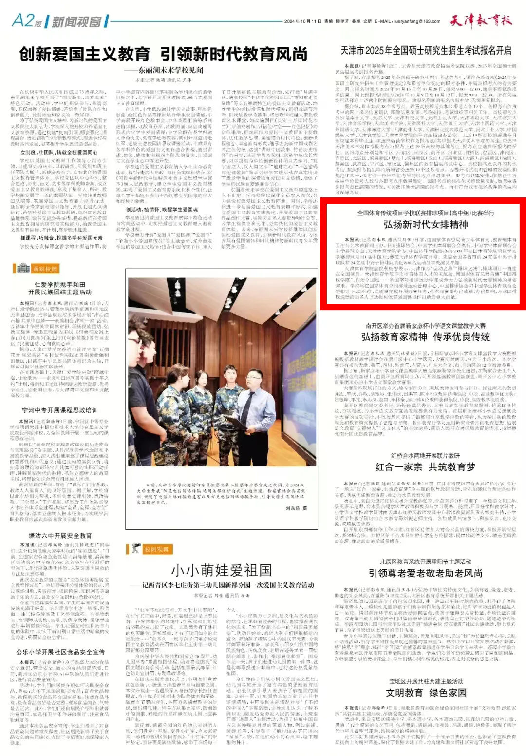日前,2024年全国体育传统项目学校联赛排球项目(高中组)比赛在万象城举行,《天津教育报》对此进行了报道。