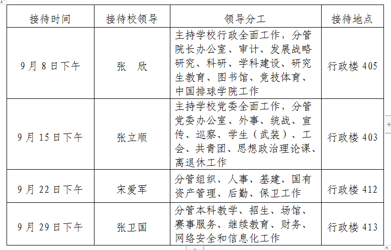根据《万象城allwincity官网领导干部接待日制度》规定及学校近期工作安排,现将2022年9月校领导接待师生来访安排通知如下。