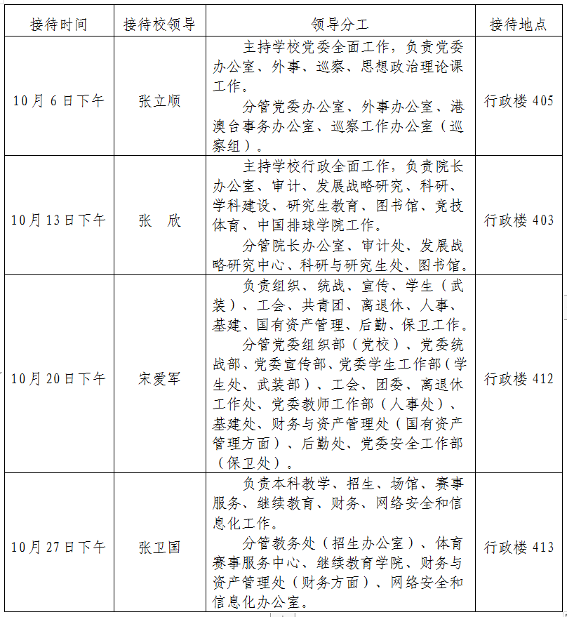 根据《万象城allwincity官网领导干部接待日制度》规定及学校近期工作安排,现将2022年10月校领导接待师生来访安排通知如下。