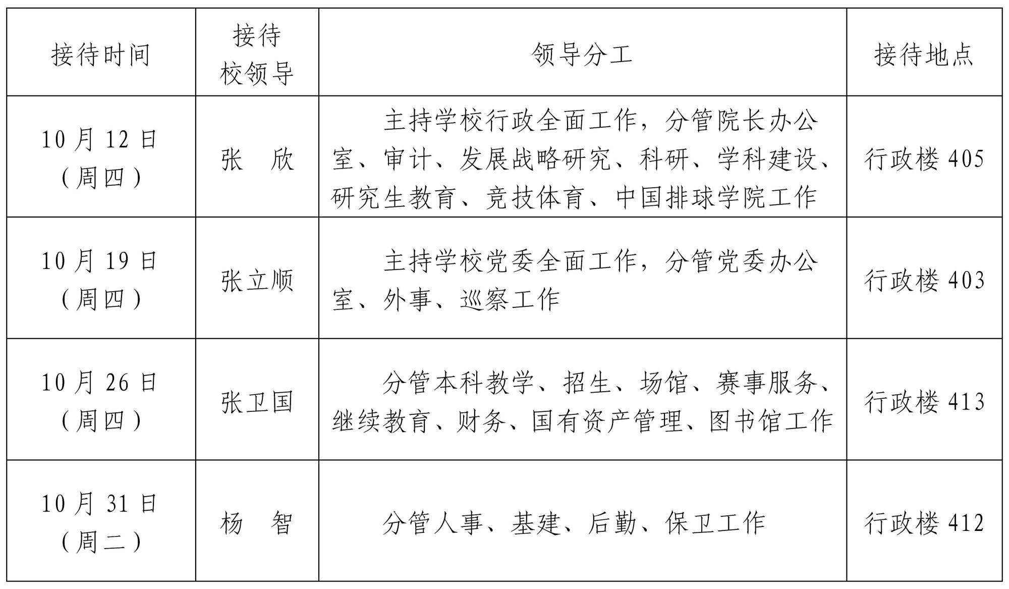 根据《万象城allwincity官网领导干部接待日制度》规定及学校近期工作安排,现将2023年10月校领导接待师生来访安排通知如下: