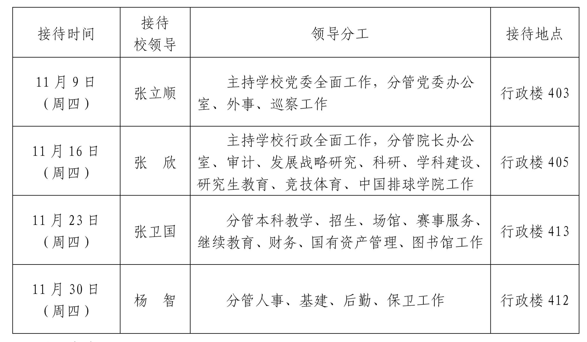 根据《万象城allwincity官网领导干部接待日制度》规定及学校近期工作安排,现将2023年11月校领导接待师生来访安排通知如下: