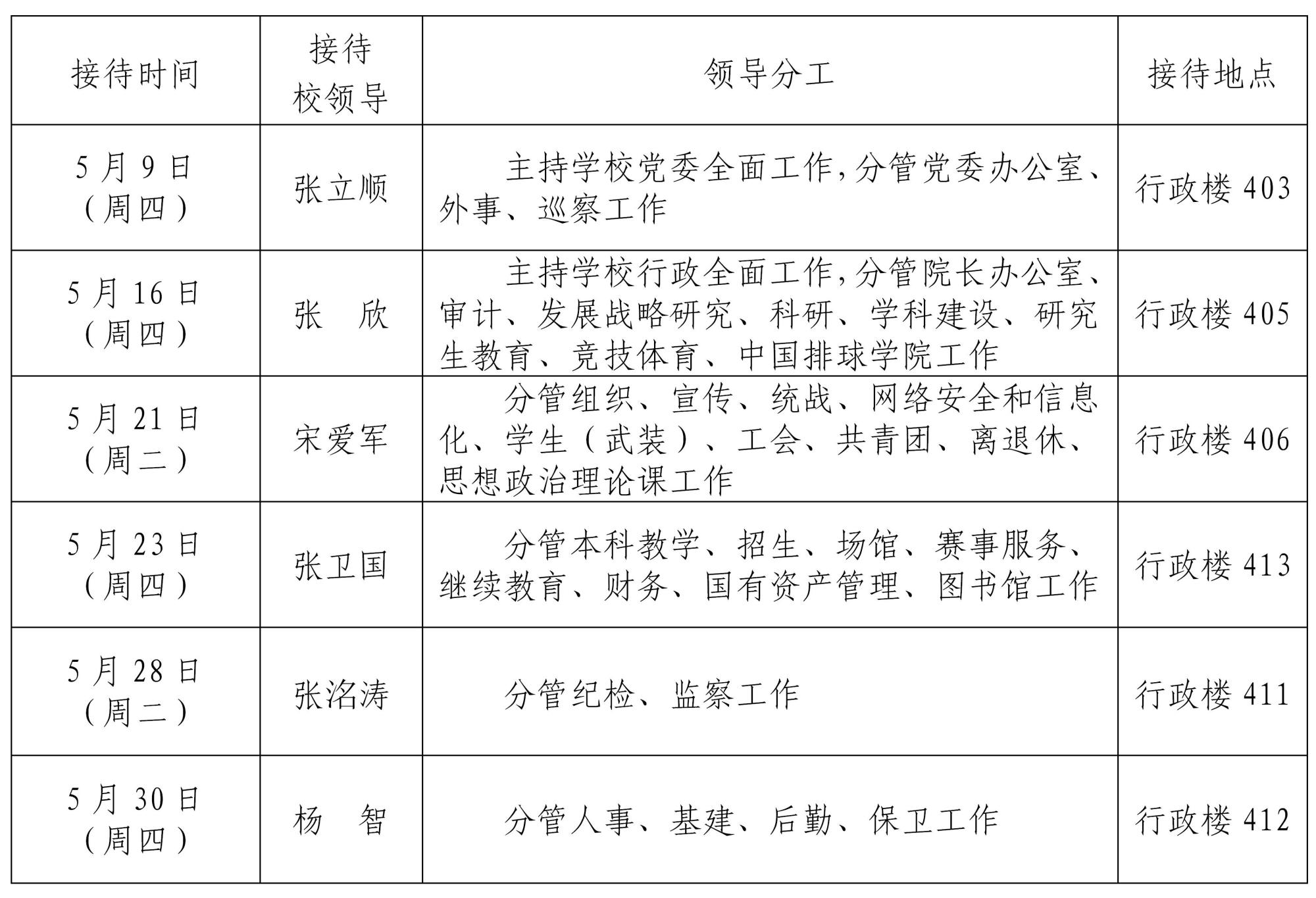 根据《万象城allwincity官网领导干部接待日制度》规定及学校近期工作安排,现将2024年5月校领导接待师生来访安排通知如下:
